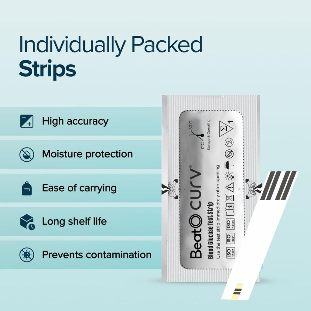 Precision and Accuracy: Specifically designed for use with the BeatO CURV Glucometer, these glucometer strips deliver highly accurate results, facilitating precise measurement of glucose levels with just a small drop of blood.