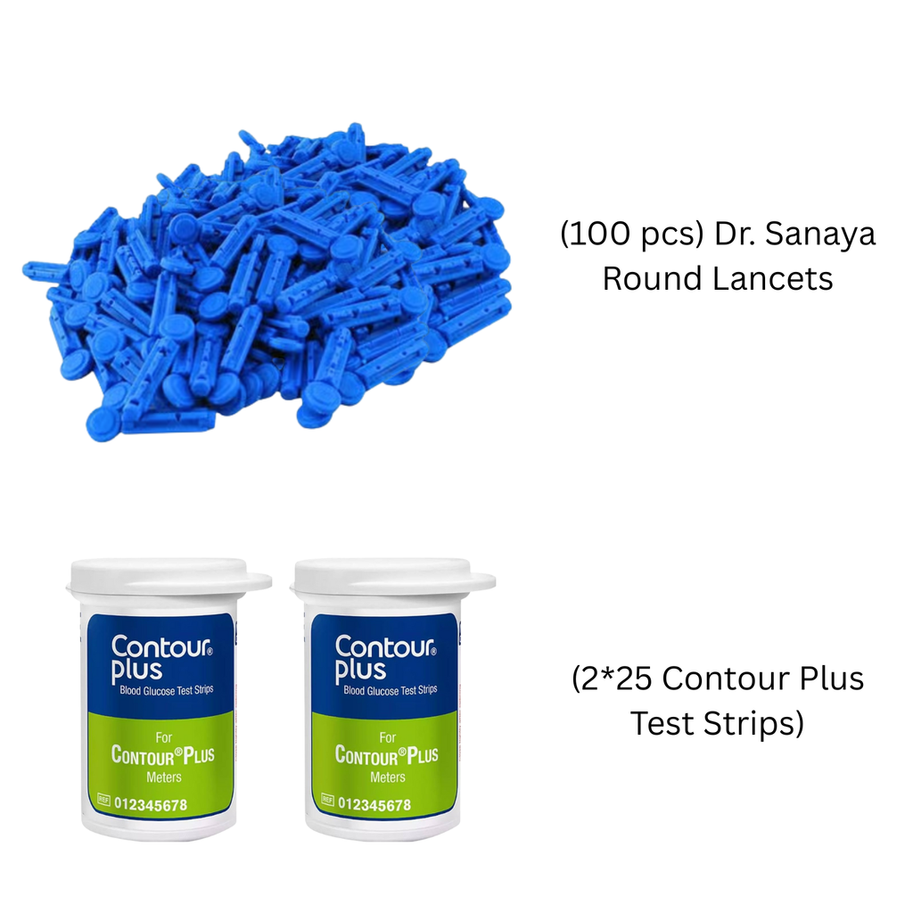 Accurate & hygienic glucose testing with Dr. Sanaya Lancets (100 pcs) + Contour Plus 50 Test Strips Combo.