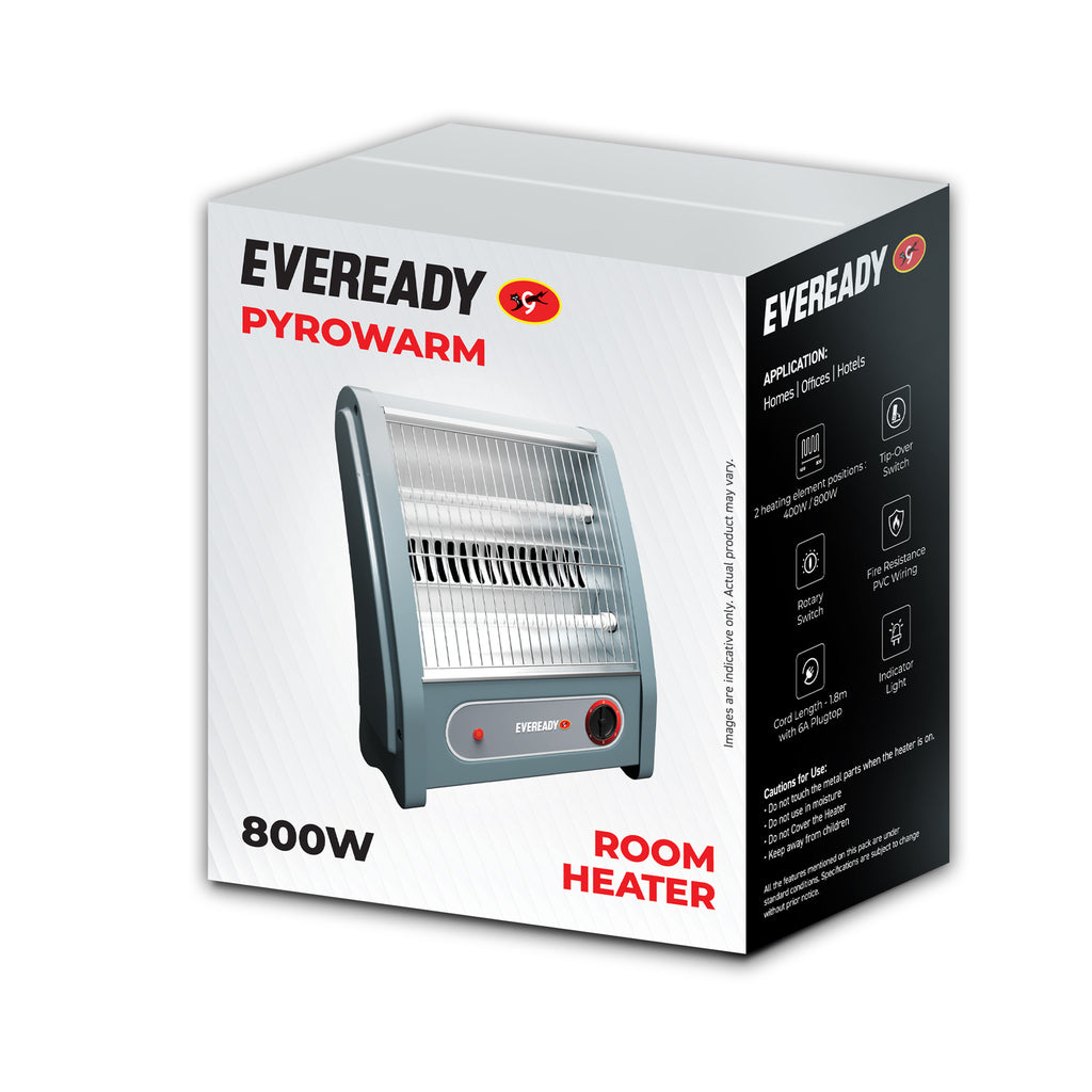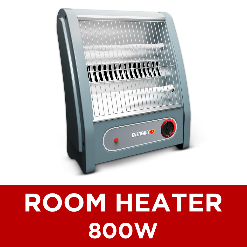 The Eveready Pyrowarm 800W Quartz Room Heater delivers fast, efficient heating with dual quartz elements and built-in tip-over protection, making it a safe and reliable winter heater for homes and offices.