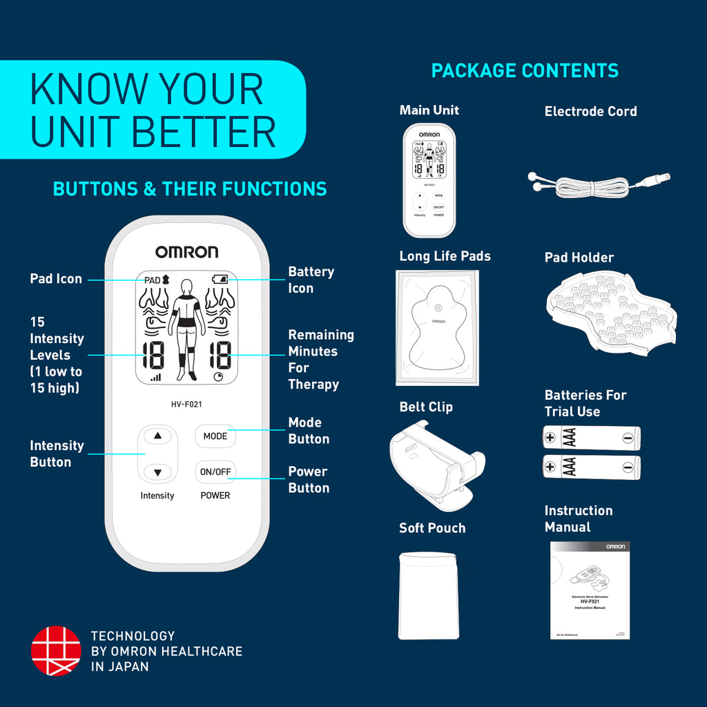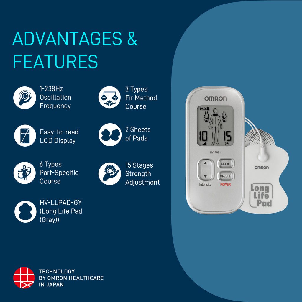 Relieve pain anytime with Omron HV F021 – compact, adjustable electrical nerve stimulator.